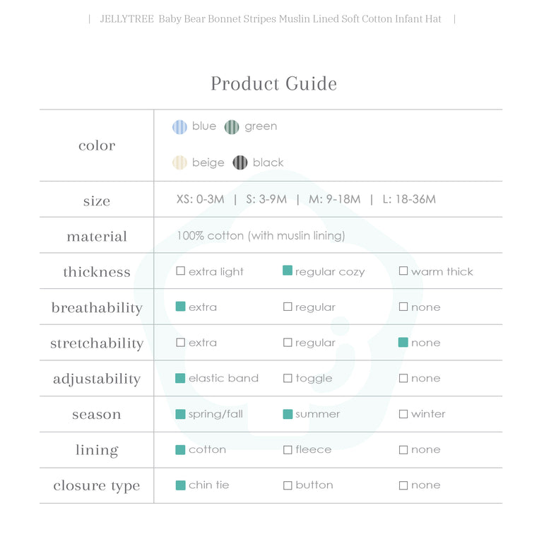 [ STYLE ] : Keep your little one stylish & protected with JELLYTREE® breathable 100% cotton baby bonnet. High quality, trustworthy materials crafted with extra care for your babies. Simple but sophisticated designs & details, available in a variety of sizes with fresh colors for growing babies.