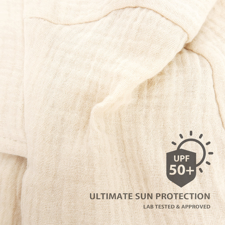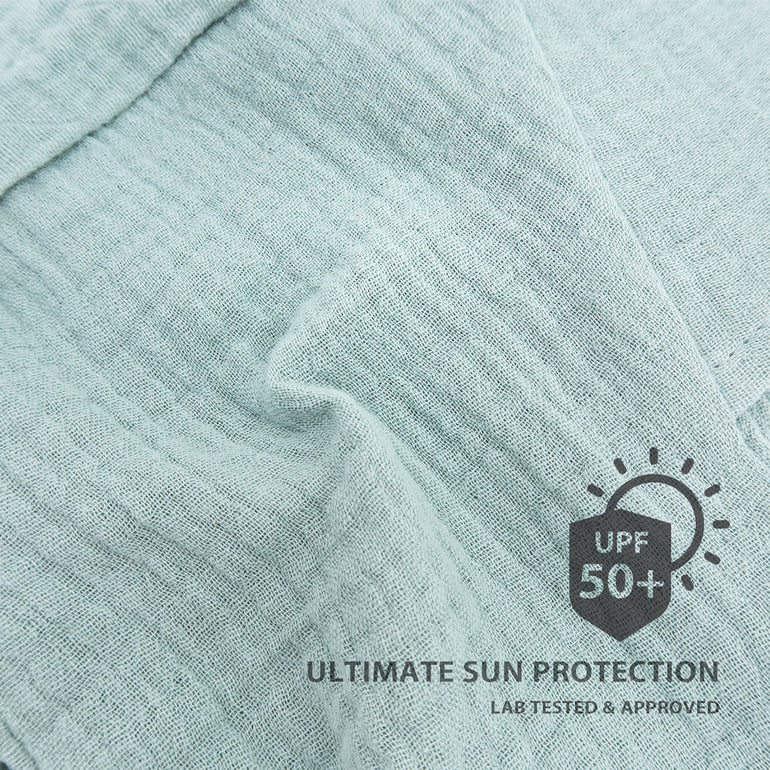 [ MATERIAL & SIZE ] : UPF 50+ Double layer breathable gauze (100% cotton). Fit ranges from 0 - 24 months (XS, S, M, L). Please check detailed measurements before placing your order.