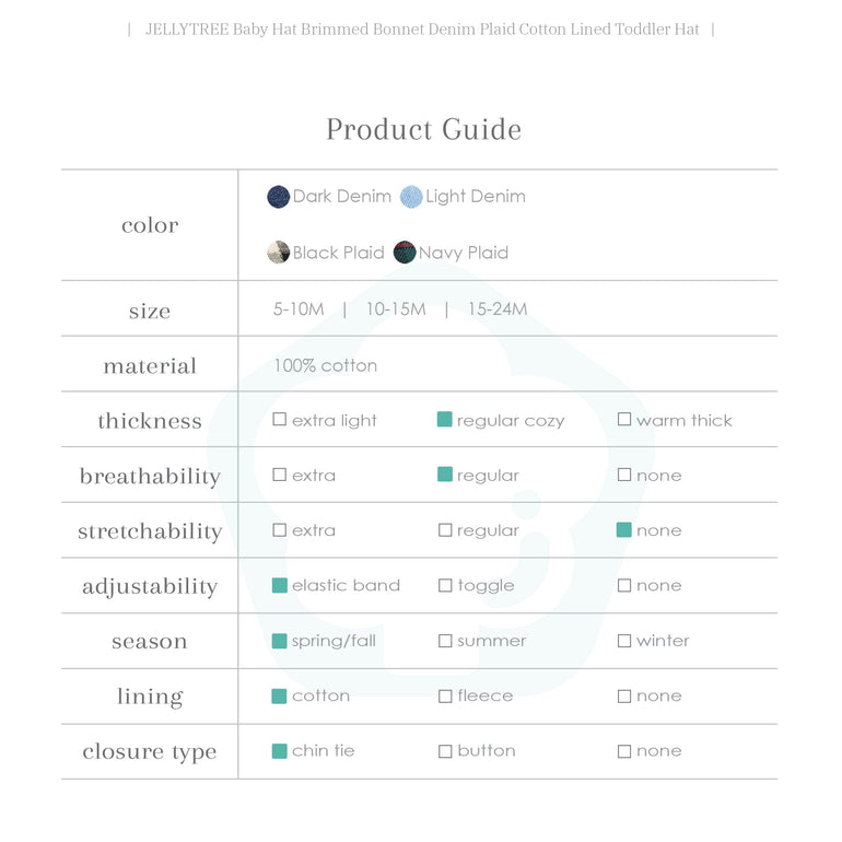 [ MATERIAL & SIZE ] : Cotton lined brimmed denim & plaid bonnet. Fit ranges from 5 - 24 months (S, M, L). Please check detailed measurements before placing your order. Please keep in mind the color of screen & photos under different lighting may differ slightly from the product you will get at home.