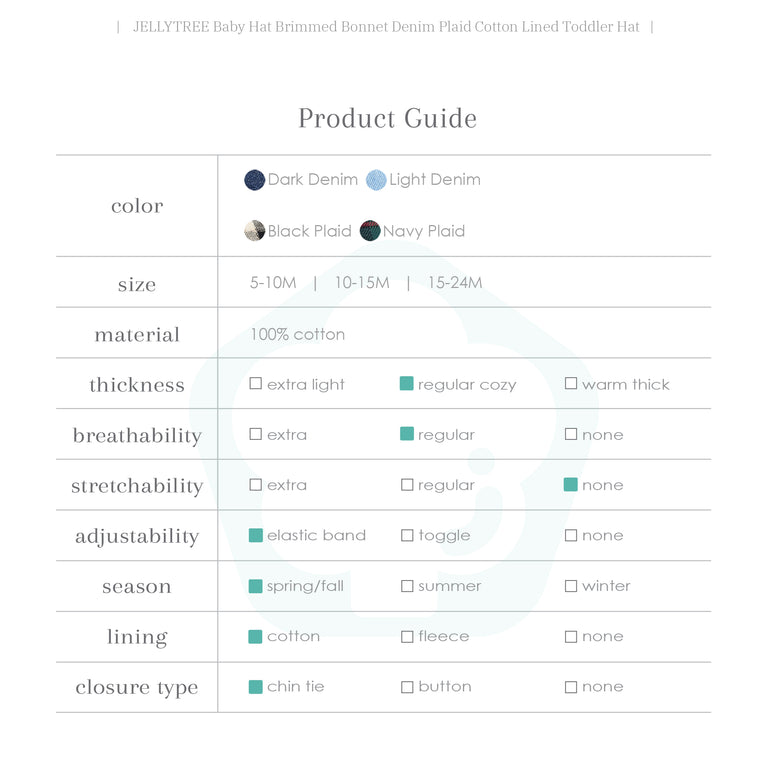 [ MATERIAL & SIZE ] : Cotton lined brimmed denim & plaid bonnet. Fit ranges from 5 - 24 months (S, M, L). Please check detailed measurements before placing your order. Please keep in mind the color of screen & photos under different lighting may differ slightly from the product you will get at home.